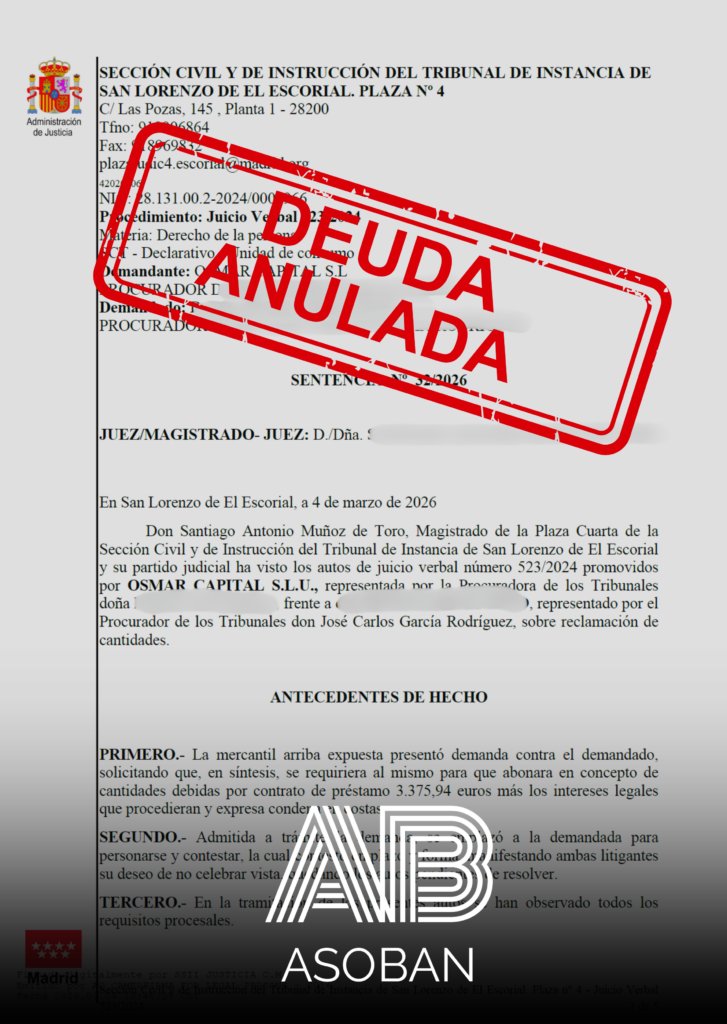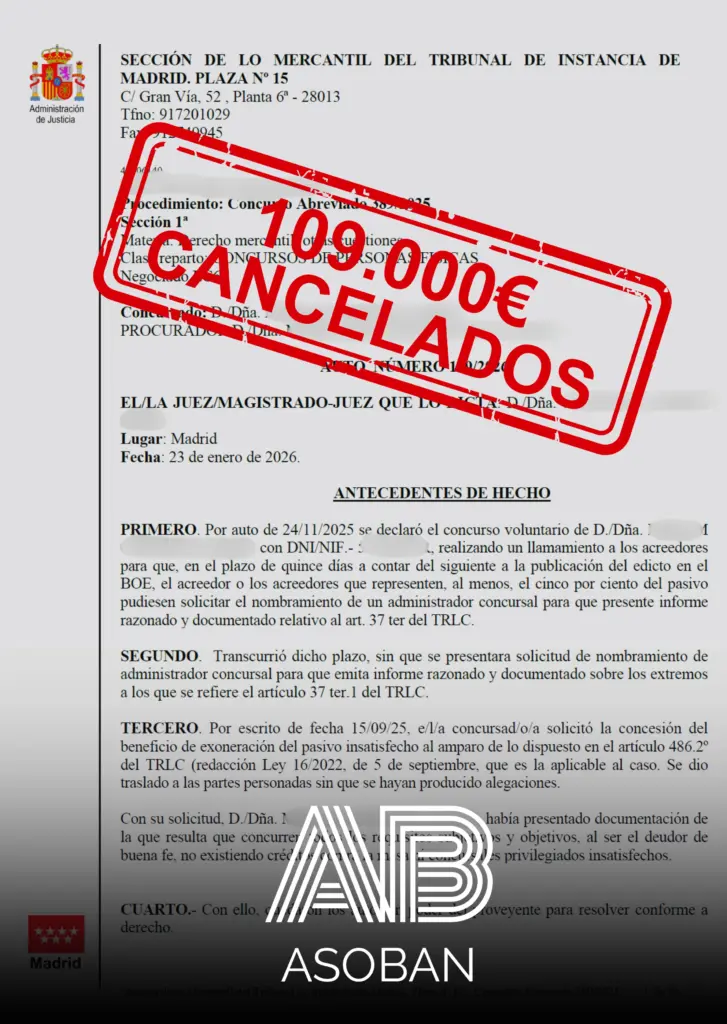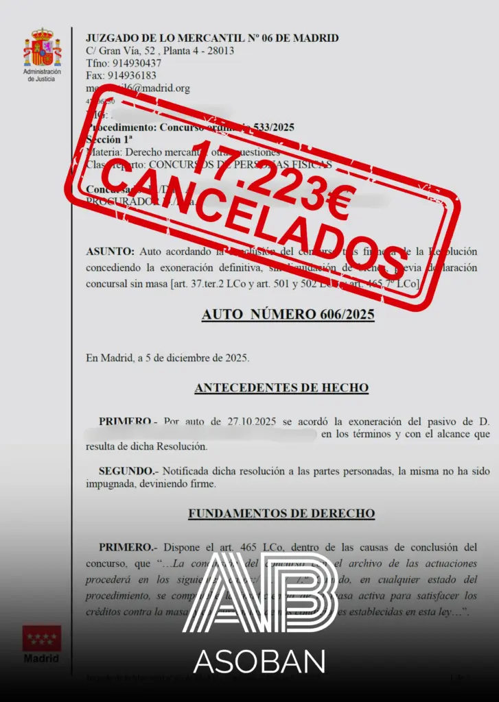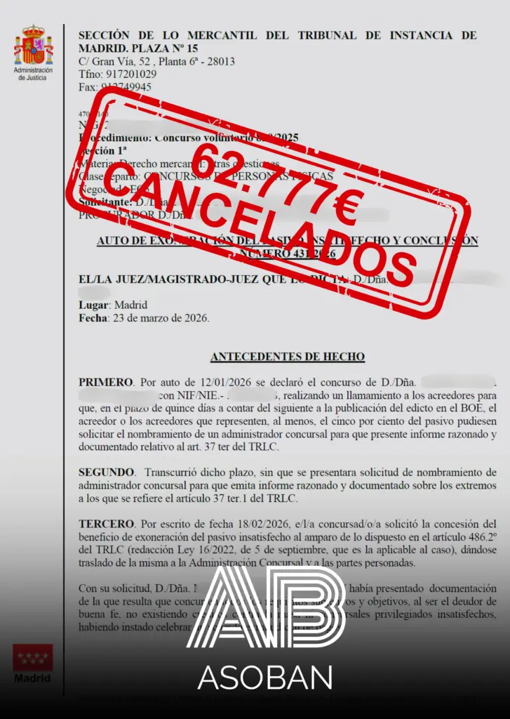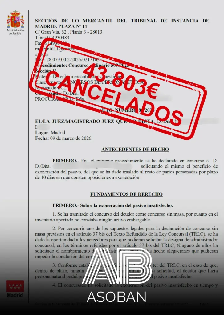 Cancelación de más de 43.000€ de deuda bancaria acumulada para empezar de cero.